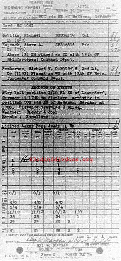 Morning report B/908FA for April 7, 1945