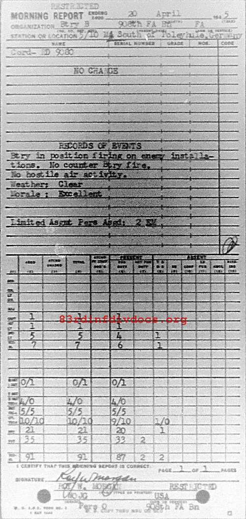 Morning report B/908FA for April 20, 1945