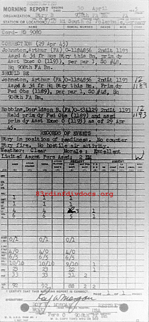 Btry in position of readiness. No counter Btry fire. No hostile air activity. Weather: Clear. Morale: Excellent.