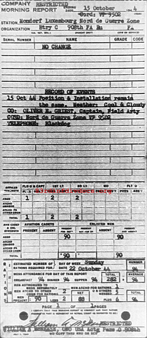 Position & installation remain the same. Weather: Cool & Cloudy. CO: Oliver E Griest, Captain, Field Arty. Cord: Nord de Guerre Zone vP9502. Telephone: Blackdog