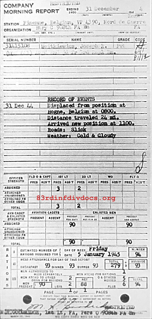 Displaced from position at Hogne, Belgium at 0800. Distance traveled 24 mi. Arrived new position at 1100. Roads: Slick. Weather: Cold & cloudy