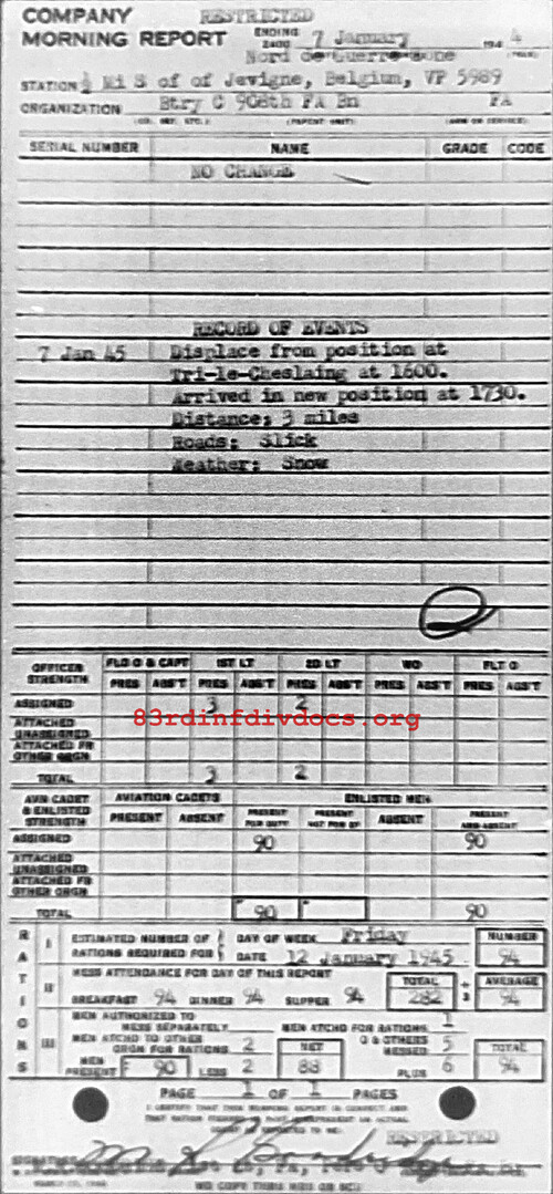 Displace from position at Tri-le-Cheslaing at 1600. Arrived in new position at 1730. Distance: 3 miles. Roads: Slick. Weather: Snow.