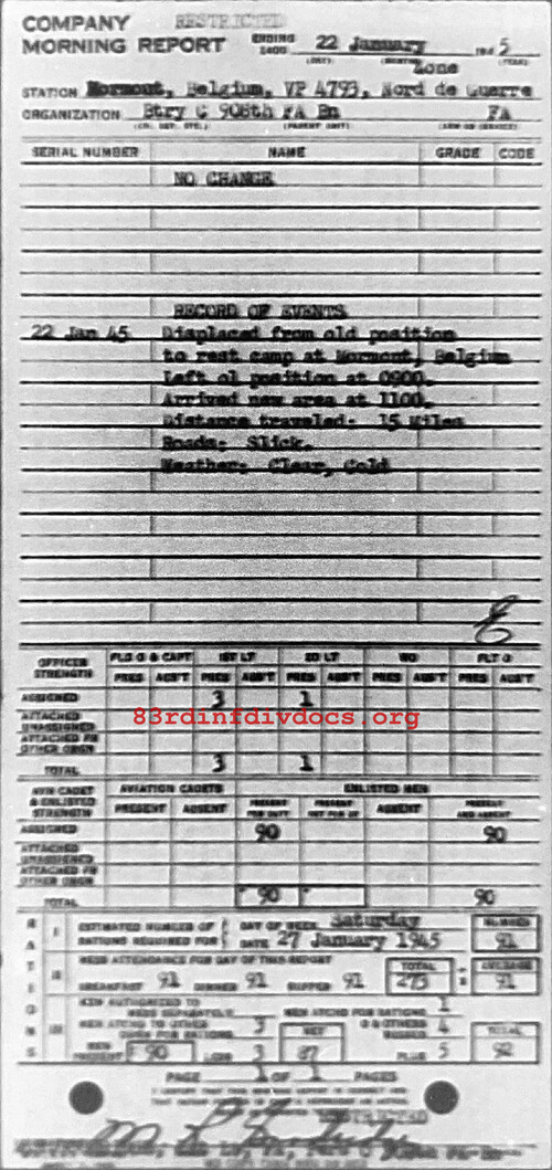 Displaced from old position to rest camp at Mormont, Belgium. Left old position at 0900. Arrived new area at 1100. Distance traveled: 15 Miles. Roads: Slick. Weather: Clear, cold.