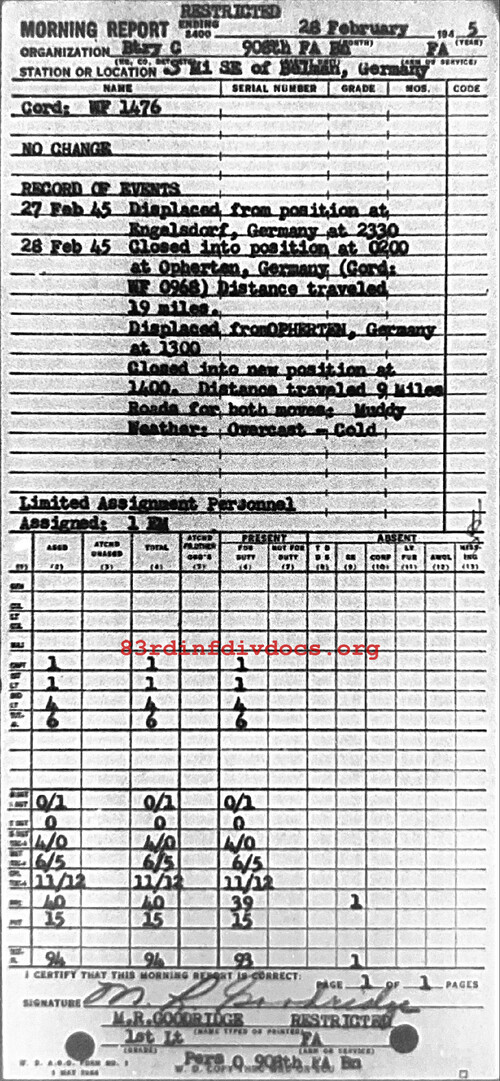 27 Feb 45: Displaced from position at Engelsdorf, Germany at 2330. 28 Feb 45: Closed into position at 0200 at Opherten, Germany (wF0968). Distance traveled 19 miles. Displaced from Opherten, Germany at 1300. Closed into new position at 1400. Distance traveled 9 miles. Roads for both moves: Muddy. Weather: Overcast, cold.