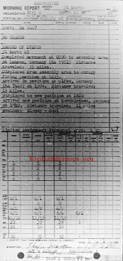 Record of events: Completed movement at 0300 to assembly area at Lunzen, Germany (rA5951). Distance traveled: 33 miles. Displaced from Assembly area to occupy firing position at 1215. Arrived in position at Olfen, Germany (rA7446) at 1300. Distance traveled: 15 miles. Displaced to new position at 1820. Arrived new position at Nordkirchen, Germany at 1910. Distance traveled: 11 miles. Weather: Cloudy, cool.