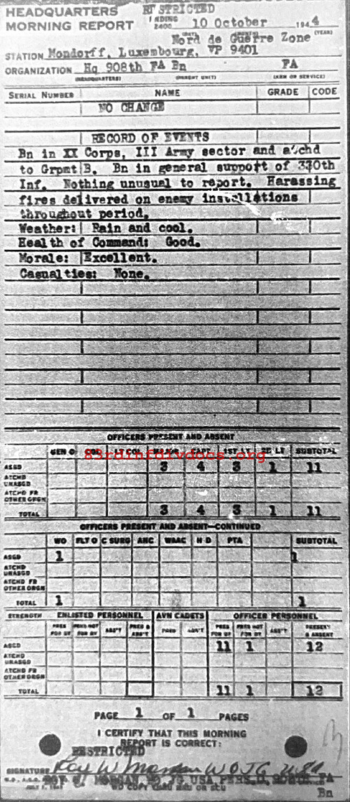Morning report HQ/908FA for October 10, 1944