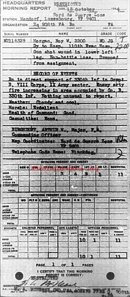 Bn in direct support of 330th Inf in Grmpt B, VIII Corps, IX Army sector. Enemy arty fire increasing in area occupied by Co B, 330th Inf. Nothing unusual to report. Weather: Cloudy and cool. Morale: Excellent. Health of Command: Good. Casualties: None. Burghduff, Arthur M., Major, FA, Commanding Officer. Map Goordinates: Nord de Guerre Zone vP9401. Telephone Code Name: Blackdog.