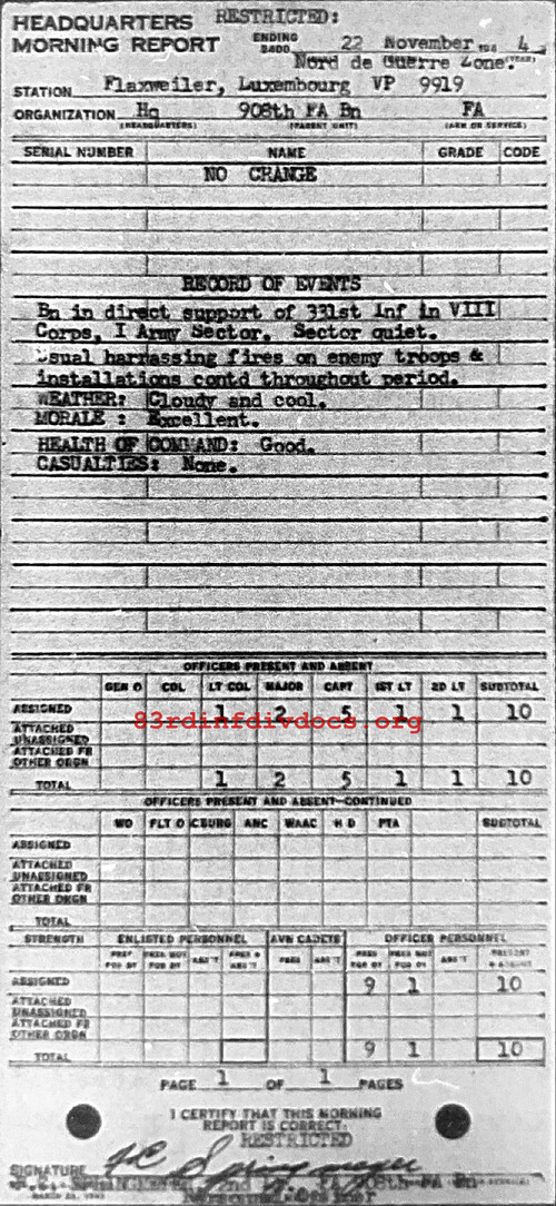 Bn in direct support of 331st Inf in VIII Corps, I Army Sector. Sector quiet. Usual harassing fires on enemy troops and installations contd throughout period. Weather: Cloudy and cool. Morale: Excellent. Health of Command: Good. Casualties: None.