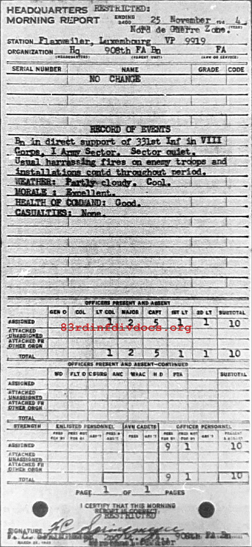 Bn in direct support of 331st Inf in VIII Corps, I Army Sector. Sector quiet. Usual harassing fires on enemy troops and installations contd throughout period. Weather: Partly cloudy. cool. Morale: Excellent. Health of Command: Good. Casualties: None.