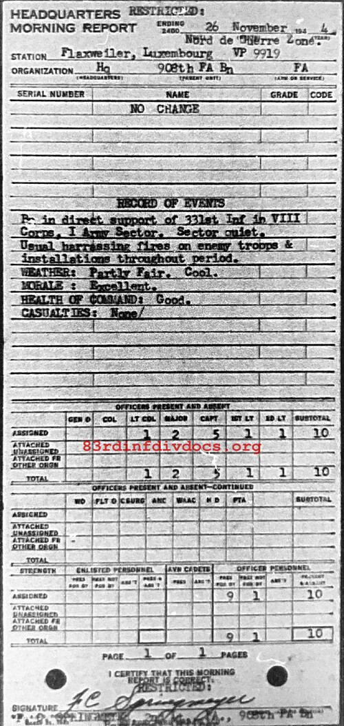 Bn in direct support of 331st Inf in VIII Corps, I Army Sector. Sector quiet. Usual harassing fires on enemy troops and installations contd throughout period. Weather: Partly fair. Cool. Morale: Excellent. Health of Command: Good. Casualties: None.