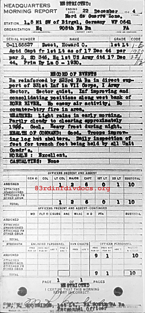 Morning report HQ/908FA for December 22, 1944