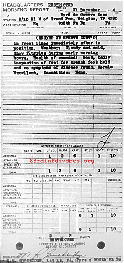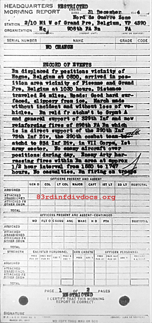 Bn displaced fr positions vicinity of Hogne, Belgium at 0800, arrived in position area vicinity of Fisenne and Grand Pre, Belgium at 1030 hours. Distance traveled 24 miles. Roads: Good hard surfaced, slippery from ice. March made without incident and without loss of vehicles. Bn reld fr atchm't to Grpmt A and general support of 329th Inf and now reinforcing fires of 8988th FA Bn which is in direct support of 290th Inf, 75th Inf Div, the 290th combat team became atchd to 83rd Inf DIv, in VII Corps, 1st army sector. No enemy aircraft over positions during day. Enemy Art harassing fires within Bn area at approx 1/2 hour interval form 1550 to 1747 hours. No casualties. Bn firing on troops.