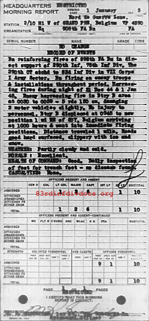 Bn reinforcing fires of 898th FA Bn in direct support of 290th Inf, 75th Inf Div. The 290th CT atchd to 83d Inf Div in VII Corps, I Army Sector. Bn firing on enemy troops & installations throughout period. Harassing fires during night of 31 Dec 44 & 1 Jan 45. Enemy harassing fire in Btry B area at 0030 to 0039 - 5 rds 150cm, damaging 2 motor vehicles slightly. No injury to personnel, Btry B displaced at 0945 to new position 1 mi NE of Soy, Belgium arriving at 1000 hours & went into immediate firing positions. Distance traveled 1 mile. Roads good hard surfaced, slippery with ice and snow. Weather: Partly cloudy and cold. Morale: Excellent. Health of Command: Good. Daily inspection of feet for trench foot - no disease found. Casualties: None.