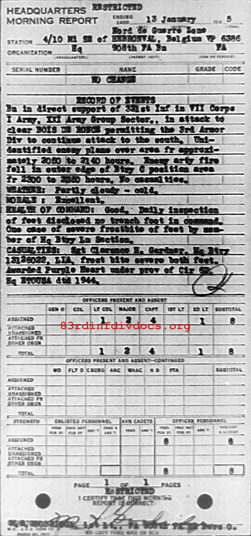 Bn in direct support of 331st Inf in VII Corps, I Army, XXI Army Group Sector., in attack to clear Bois de Ronce permitting the 3rd Armor Div to continue attack to the south. Unidentified enemy plane over area fr approximately 2050 to 2140 hours. Enemy arty fire fell in outer edge of Btry C position area fr 2300 to 2350 hours. No casualties. Weather: Partly cloudy - cold. Morale: Excellent. Health of Command: Good. Daily inspection of feet disclosed no trench foot in command. One case of severe frostbite of feet by member of Hq Btry Ln Section. Casualties: Sgt Clarence H. Gardner, Hq Btry 13126022, LIA, frost bite severe both feet. Awarded Purple Hear under prov of Cir 62, Hq ETOUSA dtd 1944.