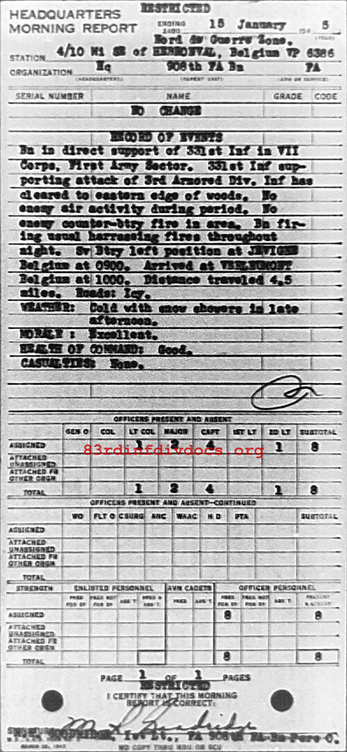 Bn in direct support of 331st Inf in VII Corps. First Army Sector. 331st Inf supporting attack of 3rd Armored Div. Inf has cleared to eastern edge of woods. No enemy air activity during period. No enemy counter-btry fire in area. Bn firing usual harassing fires throughout night. Sv Btry left position at Jevigne, Belgium at 0900. Arrived at Verleumont, Belgium at 1000. Distance traveled 4.5 miles. Roads: Icy. Weather: Cold with snow showers in 1ste afternoon. Morale: Excellent. Health of Command: Good. Casualties: None.