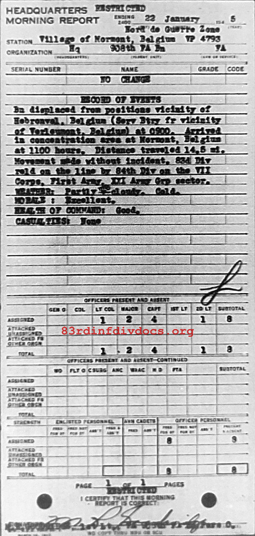 Bn displaced from vicinity of Hebronval, Belgium (Serv Btry vicinity of Verleumont, Belgium) at 0900. Arrived in concentration area at Mormont, Belgium at 1100 hours. Distance traveled 14.5 mi. Movement made without incident. 83rd reld on the line by 84th Div on the VII Corps, First Army, XXI Army Grp sector. Weather: Partly cloudy. Cold. Morale: Excellent. Health of Command: Good. Casualties: None.