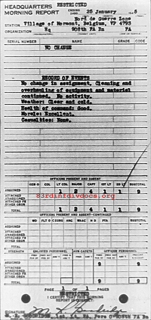 No change in assignment. Cleaning and overhauling of equipment and materiel continued. No activity. Weather: Clear and cold. Health of command: Good. Morale: Excellent. Casualties: None.
