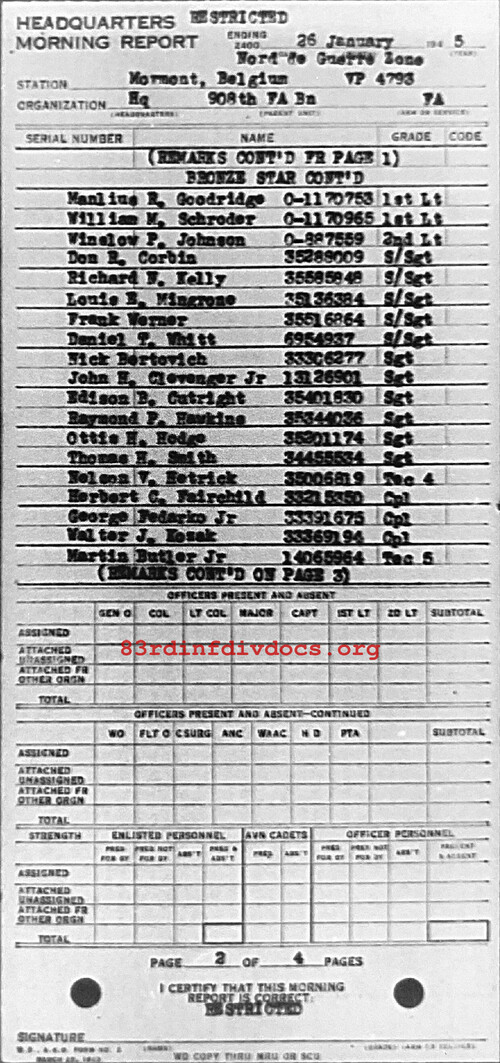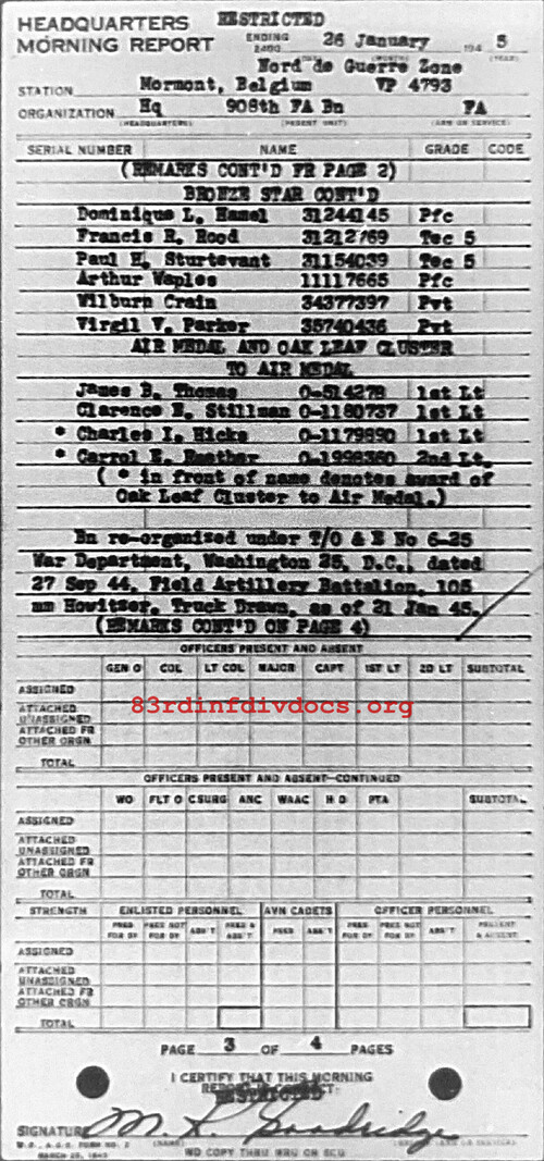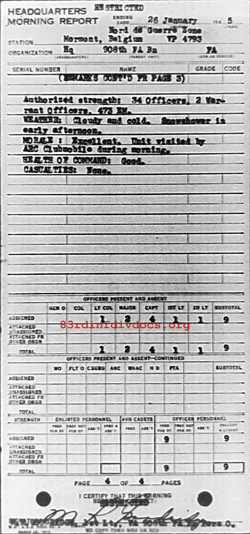 Bn re-organized under T/O & E No 6-25 War Department, Washington 25 D.C. dated 27 Sep 44, Field Artillery Battalion, 105 mm Howitzer. Truck Drawn, as of 21 Jan 45. Authorized strength: 34 Officers, 2 Warrant Officers, 473 EM. Weather: Cloudy and cold. Snowshower in early afternoon. Morale: Excellent. Unit visited by ARC Clubmobile during morning. Health of Command: Good. Casualties: None.