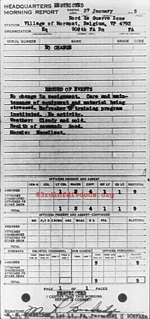 No change in assignment. Care and maintenance of equipment and materiel being stressed. Refresher training program instituted. No activity. Weather: Cloudy and cold. Health of Command: Good. Morale: Excellent.