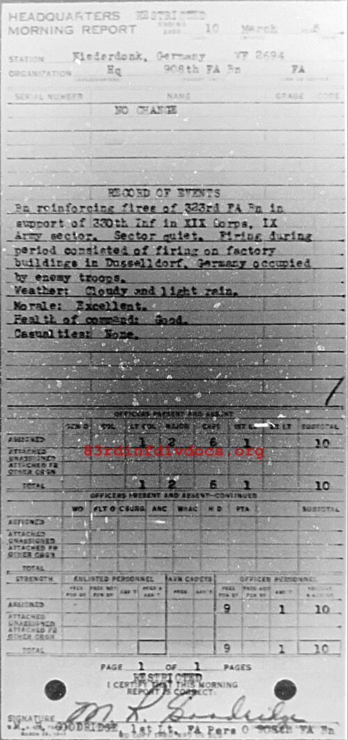 Bn reinforcing fires of 323rd FA Bn in support of 330th Inf in XIX Corps, IX Army sector. Sector quiet. Firing during period consisted of firing on factory buildings in Dusseldorf, Germany occupied by enemy troops. Weather: Cloudy and light rain. Morale: Excellent. Health of Command: Good. Casualties: None.