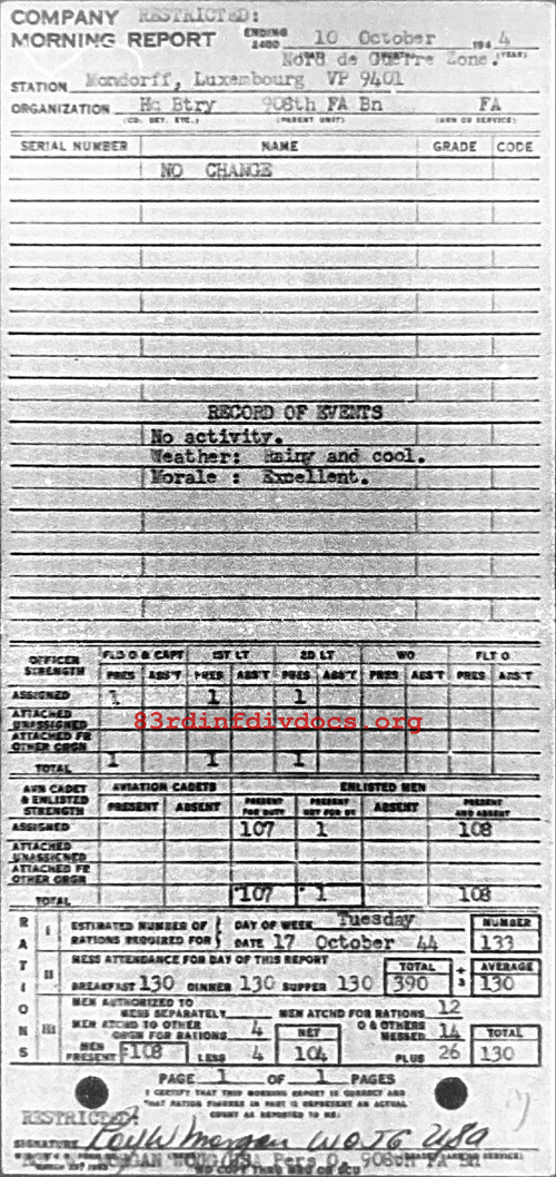 No activity. Weather: Rainy and cool. Morale: Excellent.
