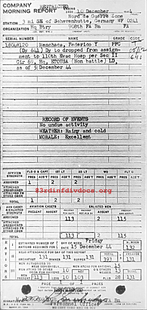 Morning report HQBTRY/908FA for December 10, 1944