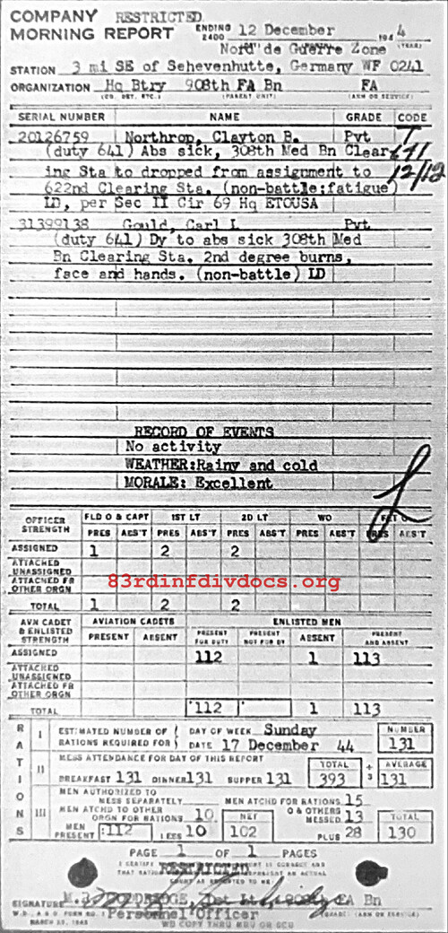 No activity. Weather: Rainy and cold. Morale: Excellent.