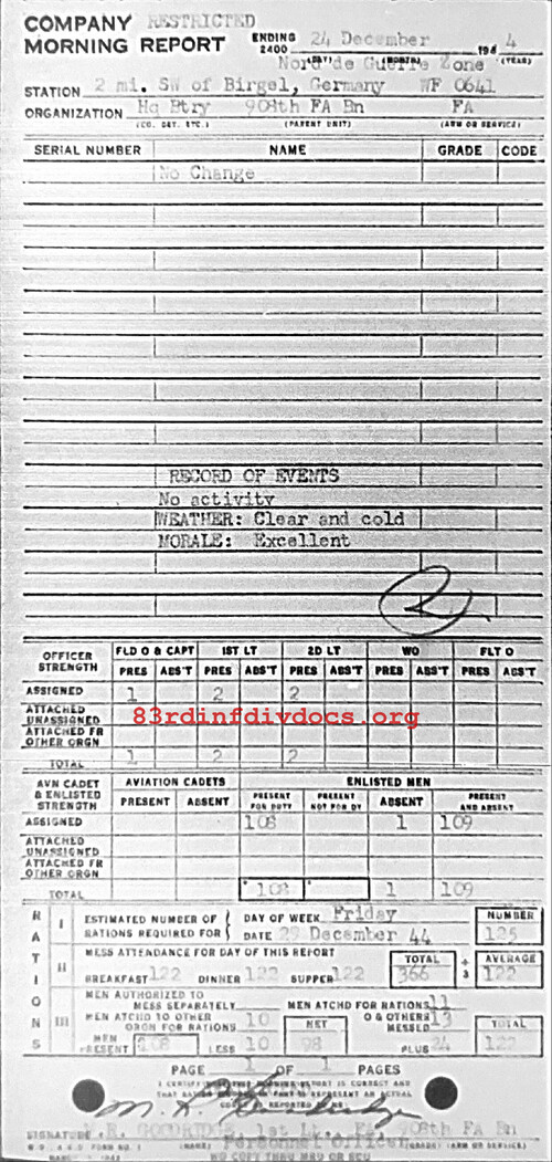 No activity. Weather: Clear and cold. Morale: Excellent.