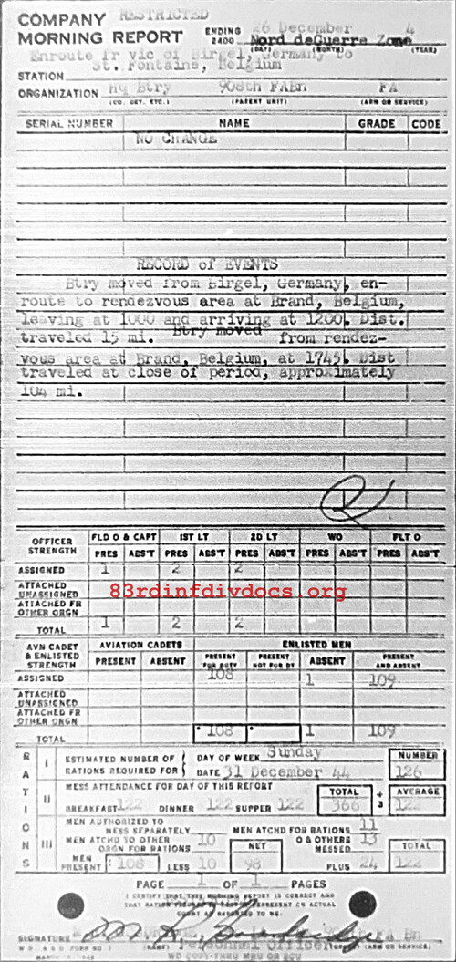 Btry moved from Birgel, Germany, enroute to rendezvous area at Brand, Belgium leaving at 1000 and arriving at 1200. Dist. traveled 15 mi. Btry moved from rendezvous area at Brand, Belgium at 1745. Dist traveled at close of period, approximately 104 mi.