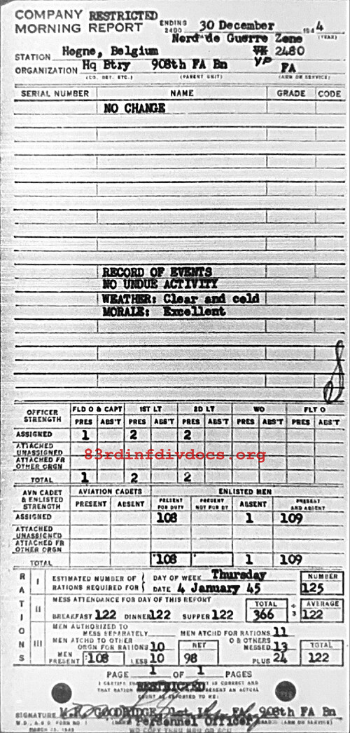 No undue activity. Weather: Clear and cold. Morale: Excellent.