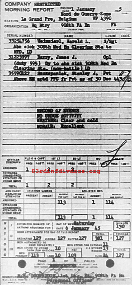 No undue activity. Weather: Clear and cold. Morale: Excellent.