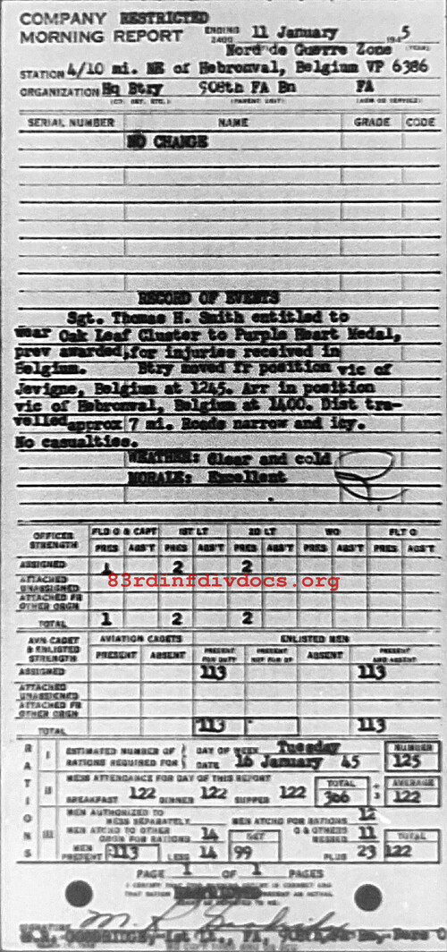 Sgt. Thomas H. Smith entitled to wear Oak Leaf Cluster to Purple Heart Medal, prev awarded, for injuries received in Belgium. Btry moved fr position vic of Jevigne, Belgium at 1245. Arr in position vic of Hebronval, Belgium at 1400. Dist traveled approx 7 mi. Roads narrow and icy. No casualties. Weather: Clear and cold. Morale: Excellent.