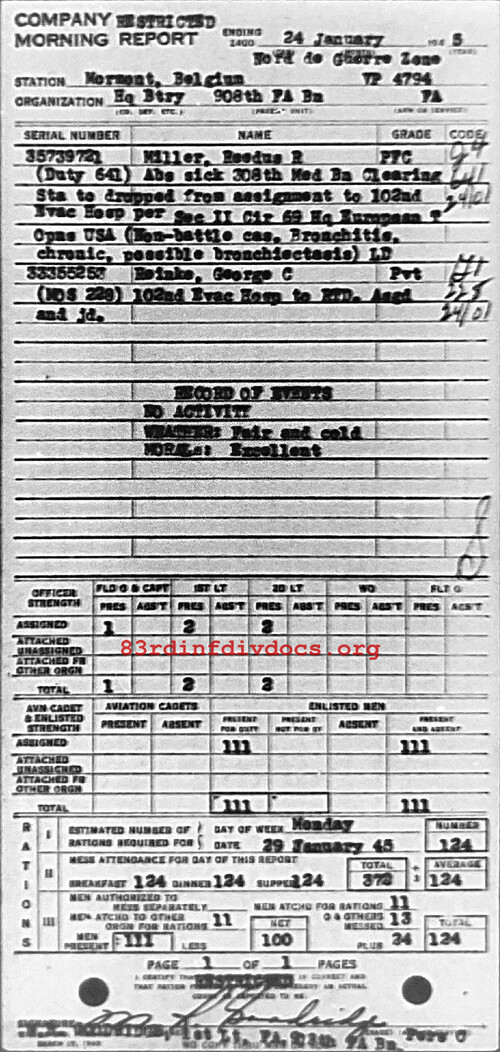 Morning report HQBTRY/908FA for January 24, 1945
