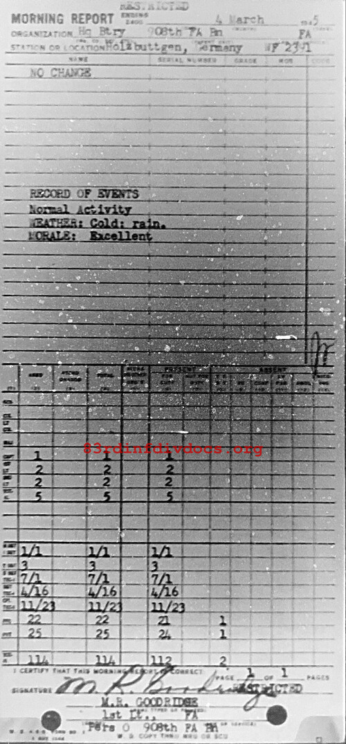 Morning report HQBTRY/908FA for March 4, 1945
