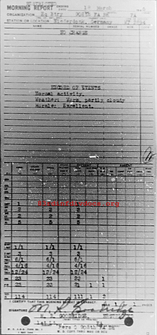 Morning report HQBTRY/908FA for March 18, 1945