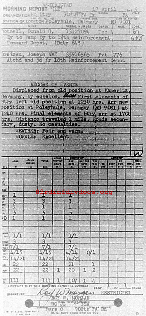 Displaced from old position at Kameritz, Germany, by echelon. First elements of Btry left old position at 1230 hrs. Arr new position at Poleyhule, Germany, rD9081 at 1240 hrs. Final elements of btry arr at 1700 hrs. Distance traveled 1 mile. Roads: secondary, dusty. No casualties. Weather: Fair and warm. Morale: Excellent.