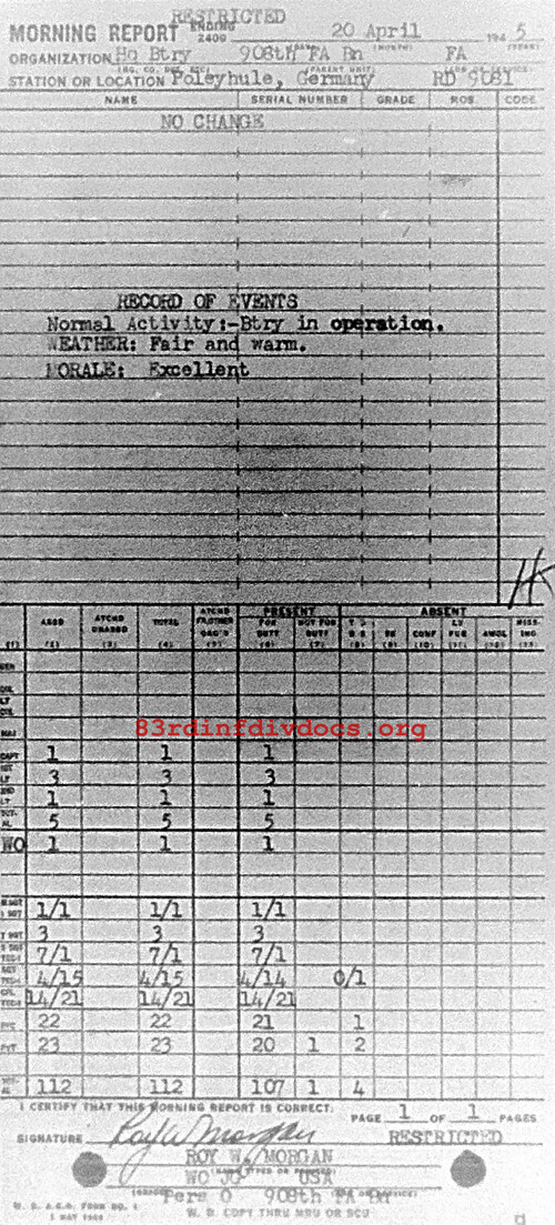 Normal activity: Btry in operation. Weather: Fair and warm. Morale: Excellent.