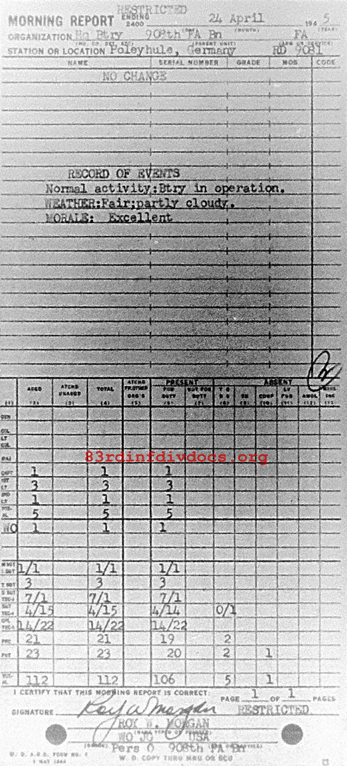 Normal activity: Btry in operation. Weather: Fair, partly cloudy. Morale: Excellent.