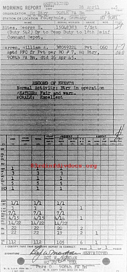 Normal activity: Btry in operation. Weather: Fair and warm. Morale: Excellent.