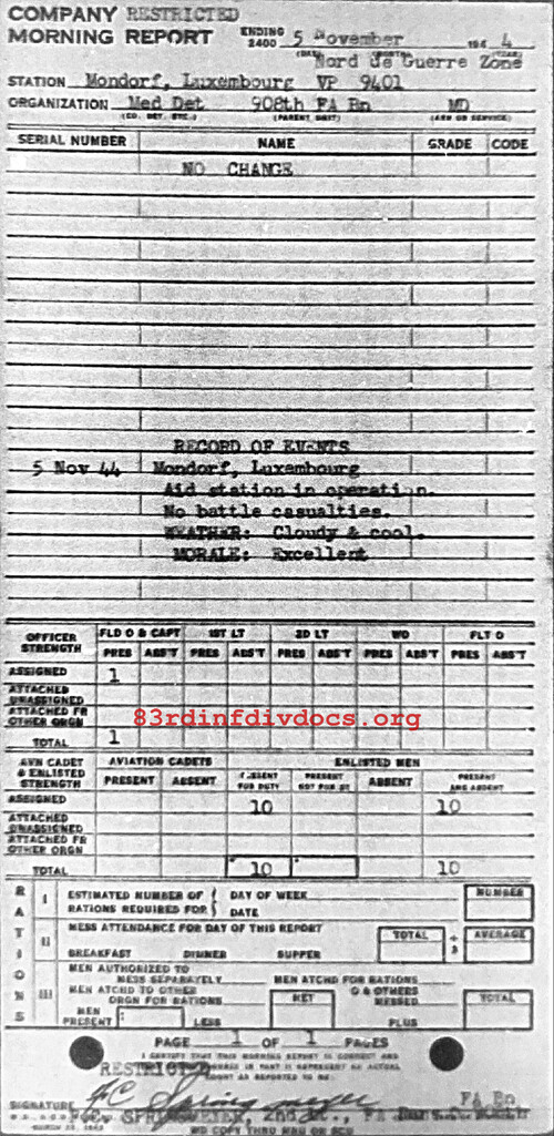 Aid station in operation. No battle casualties. Weather: Cloudy & cool. Morale: Excellent.