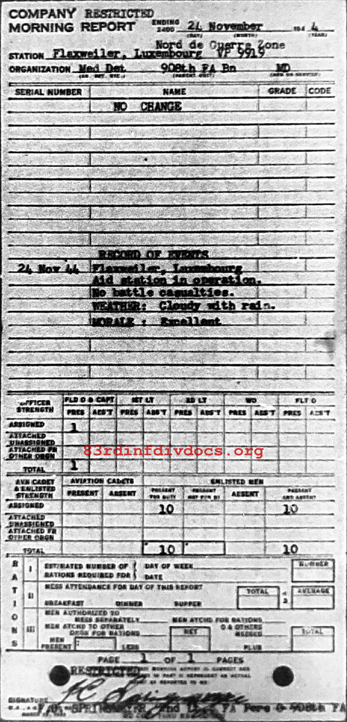 Aid station in operation. No battle casualties. Weather: Cloudy with rain. Morale: Excellent.