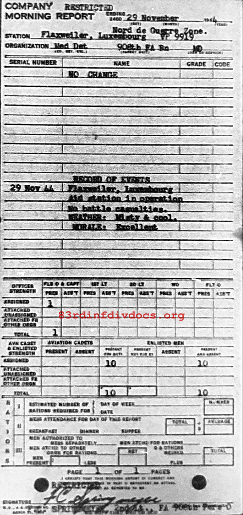 Aid station in operation. No battle casualties. Weather: Misty & cool. Morale: Excellent.