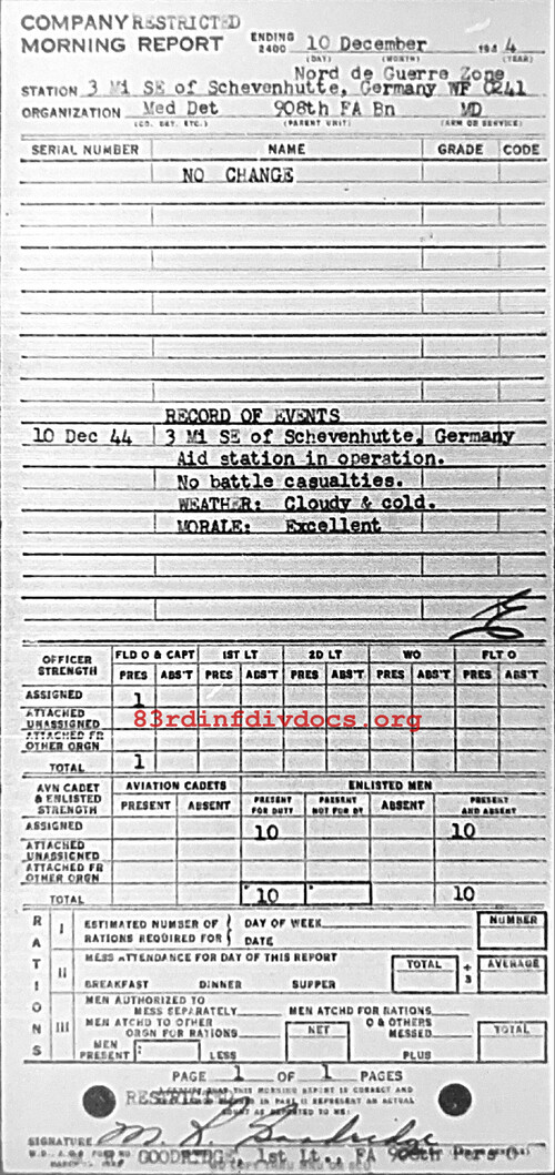 Aid station in operation. No battle casualties. Weather: Cloudy & cold. Morale: Excellent.