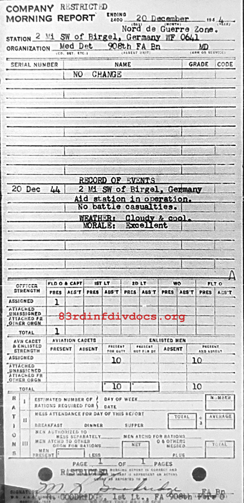 Aid station in operation. No battle casualties. Weather: Cloudy & cool. Morale: Excellent.