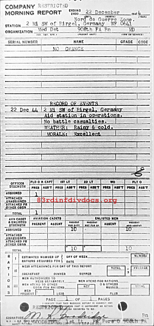 Aid station in operation. No battle casualties. Weather: Rainy & cold. Morale: Excellent.