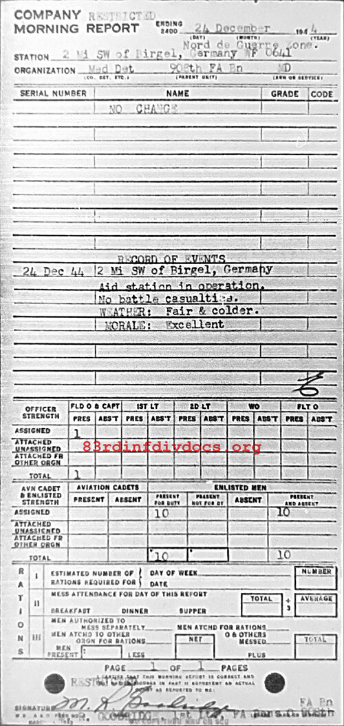 Aid station in operation. No battle casualties. Weather: Fair & colder. Morale: Excellent.