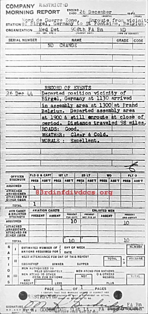 Departed position in vicinity of Birgel, Germany at 1130 arrived in assembly area at 1300 at Brand, Belgium. Departed assembly area at 1900 & still enroute at close of period. Distance traveled 98 miles. Roads: Good. Weather: Clear & cold. Morale: Excellent.