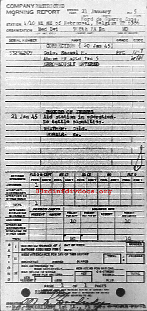 Aid station in operation. No battle casualties. Weather: Cold. Morale: Excellent.