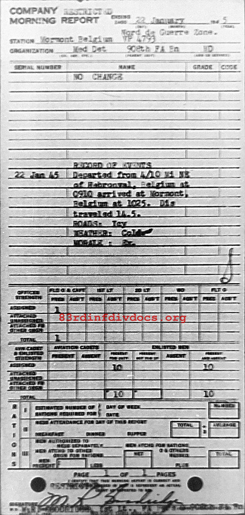 Departed from 4/10 Mi NE of Hebronval, Belgium at 0910 arrived at Mormont, Belgium at 1025. Dis traveled 14.5. Roads: Icy. Weather: Cold. Morale: Excellent.
