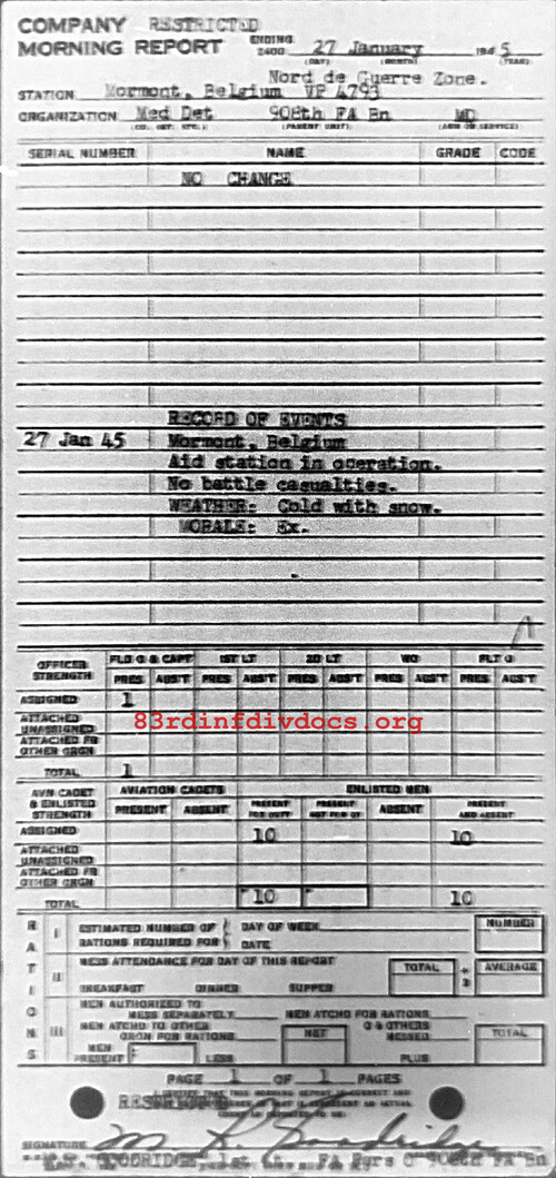 Aid station in operation. No battle casualties. Weather: Cold with snow. Morale: Excellent.
